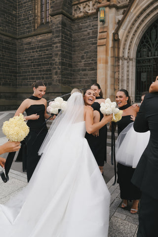 They were obsessed with it from the moment they tried it on at the Armadale Styling Suite. It was almost an instant “yes” for everyone. I had a mix of body types — one of my bridesmaids was postpartum, another was pregnant, one is super tall, and a few are quite petite — and the dress looked incredible on all of them. It brought everyone together while still allowing each girl to feel like herself.