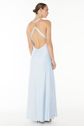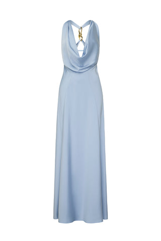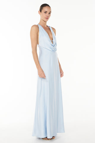 The Charmed Cowl Slip Dress features a deep cowl neckline and plunging back, with crossed back straps and a gold knot buckle for a refined touch. The maxi length and panelled skirt add dramatic flair, while the luxe satin fabric with a subtle sheen enhances its elegant appeal.