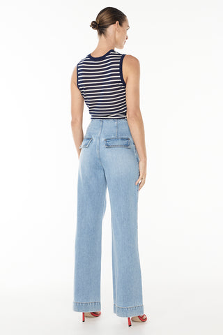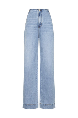 A timeless denim staple, these high-waisted jeans feature a straight leg silhouette in a vintage wash blue. Designed with side front pockets and back flap pockets, they blend classic styling with everyday practicality, easy to dress up or down.