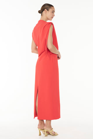 Understated drama meets refined design in the High Times Drape Dress. Crafted from luxurious Italian fabric, this maxi silhouette features soft shoulder tucks gathered with polished gold toned chain-link hardware, falling into fluid cape-style sleeves. A straight neckline and column skirt complete the look with clean, modern lines, effortlessly elegant for evening or occasion dressing.