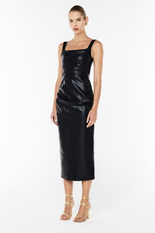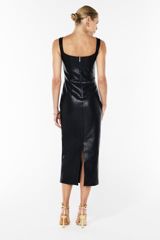 The Infinite Limits Balconette Dress. combines modern sophistication with thoughtful design. Featuring a straight neckline with wide straps, it offers a flattering fitted silhouette enhanced by considered tucks through the bodice and waist. A back split ensures ease of movement, while the high-quality vegan leather adds a sleek, sustainable touch.