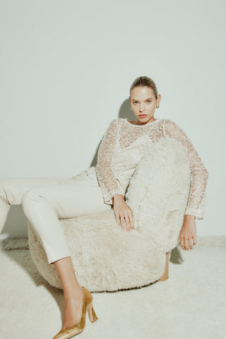 The Opera Buff Long Sleeve Top combines sleek sophistication with modern edge. Crafted from fine mesh, it features intricate vegan leather sequin appliqué and a chic boat neck. The removable cami lining adds versatility, while the regular fit ensures comfort and style. Perfect for dressing up or down, this top makes a statement on its own.