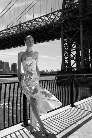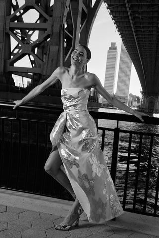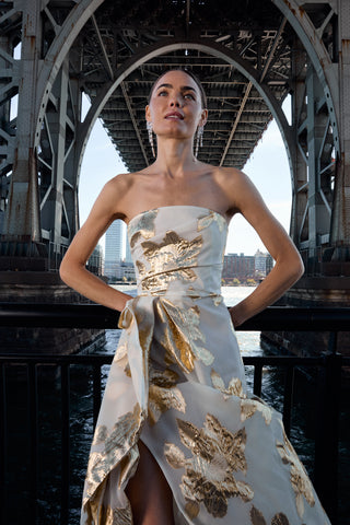 This strapless gown combines sculpted tailoring with dramatic, flowing detail. The fitted bodice features considered tucks for a flattering silhouette, while a split curved hemline allows movement and reveals subtle elegance. A cascading ruffle flows from the waist to the floor, creating a striking, statement-making effect. Crafted from French metallic jacquard, the gown shimmers with refined sophistication.