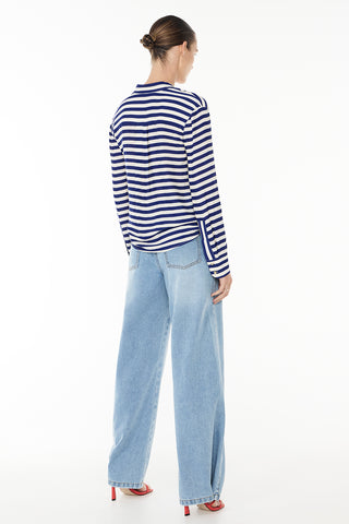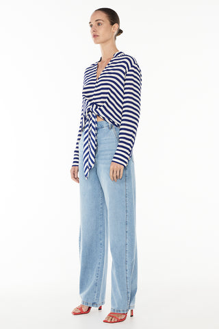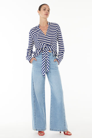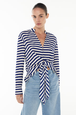 This long-sleeved blouse is a refined take on everyday dressing. Crafted from soft viscose crepe in a blue and shell stripe, it drapes effortlessly. A mandarin-style collar and wide self-tie at the front adds a modern, feminine edge. The cuffed sleeves are finished with signature MC bauble buttons for a touch of subtle charm. Perfect tucked into tailored trousers or worn loose for laid-back sophistication.