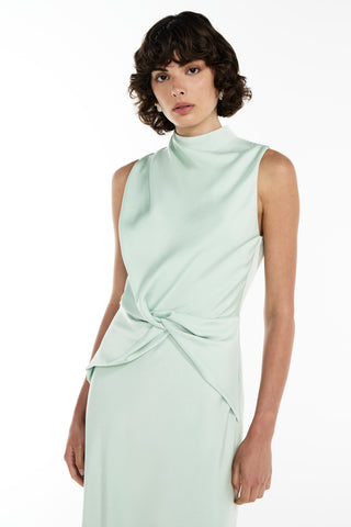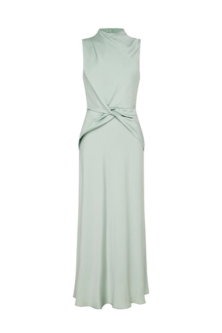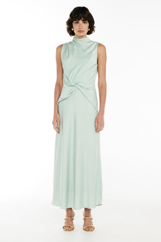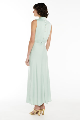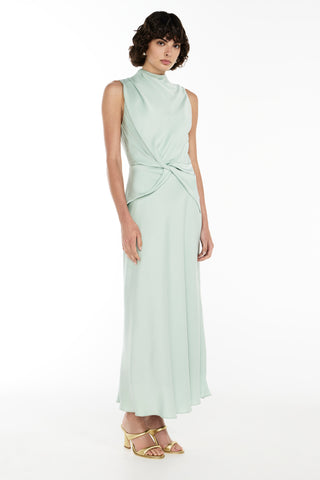 The Divine Feminine Midi Dress exudes elegance and sophistication. Featuring a beautiful twist at the center waist, a gracefully draped high neckline with delicate tucks at the shoulder, and a sleeveless design, this dress is perfect for any special occasion. The back neck closure is adorned with dainty gold toned bauble buttons, adding a touch of luxury to the look. The bias cut skirt falls to the ankle, creating a sleek and flattering silhouette.