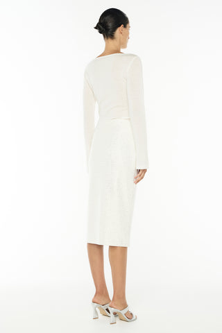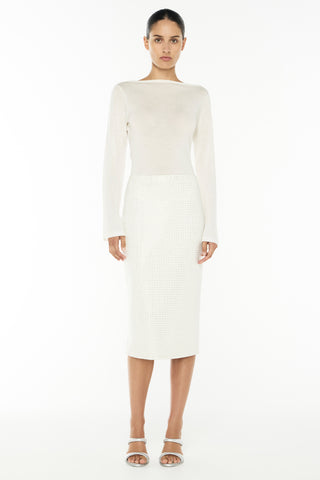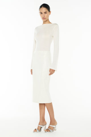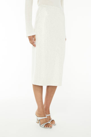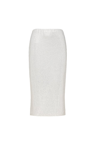 The Diamante Brilliante Skirt features shimmering diamantes on a luxe stretch base, creating a statement of refined elegance. With a flattering midi length and a fitted silhouette, this skirt is enhanced by an elasticated waistband for comfort and ease. Perfect for elevating any ensemble with a touch of sparkle.