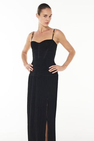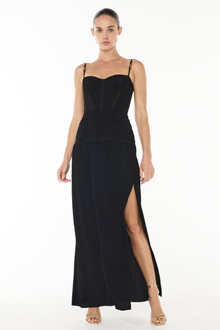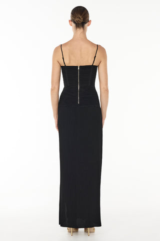 Make a stylish statement at your next event in the Double Time Pleat Dress. The dress features elegant pleats throughout and considered boning through the corset top and flows into a beautiful maxi skirt with a subtle split.