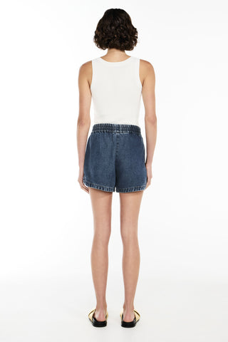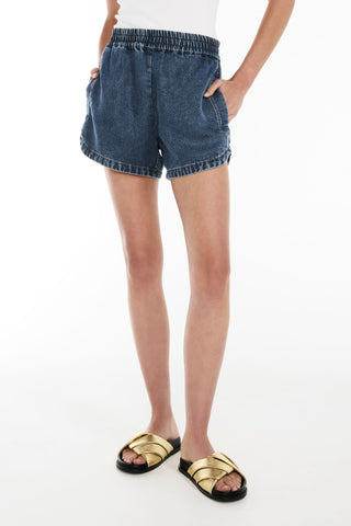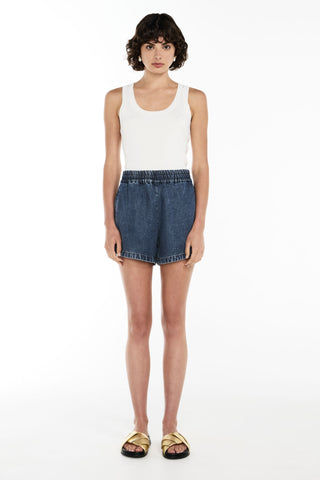Introducing the LA Mood Short, crafted from soft indigo blue denim. Designed to sit at a flattering mid-thigh length, these shorts feature a high-rise waistband for a comfortable and perfect fit. With convenient side pockets, they are a versatile addition to your wardrobe, perfect for any occasion.