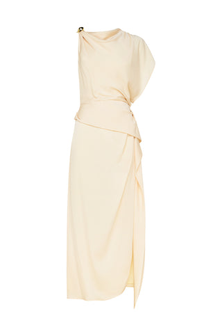 Make a statement with our Melodrama Asymmetric Dress, featuring a sleek one shoulder, asymmetrical neckline and eye-catching hardware button details on the opposite side. The pleated, ruched waist enhances the female body, while the side split adds a touch of allure. Perfect for any special occasion, this dress effortlessly combines sophistication and style.