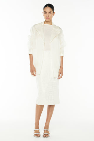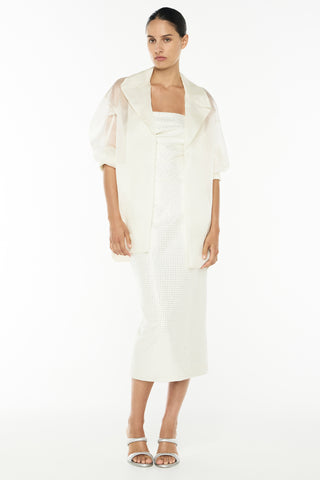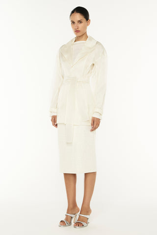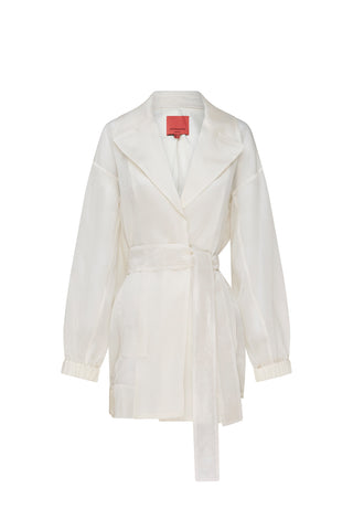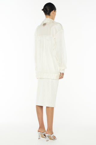 The Organza Bomber is the ultimate layering piece, blending effortless style with versatility. Crafted from luxurious silk organza, it features classic bomber jacket detailing, elasticated cuffs and hem, and an optional waist tie for a customisable fit. Perfect for adding a touch of sophistication to any look.